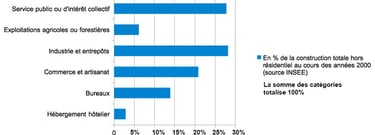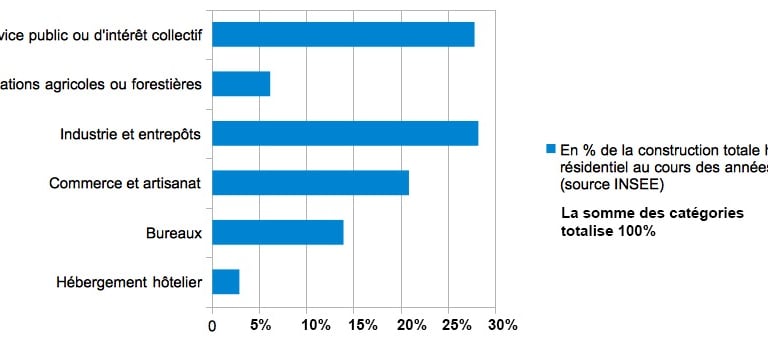 L’activité, comme on le pense souvent en matière de programmation urbaine, ne se résume pas au commerce et au bureau. Comme on le voit ci-dessous, au cours des années 2000, la construction de locaux non résidentiels s’est constituée à 28% de locaux industriels et d’entrepôts, à 21% de locaux de commerce et d’artisanat, et seulement 14% de bureaux.