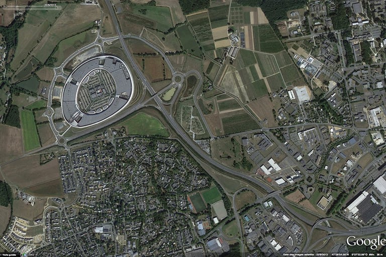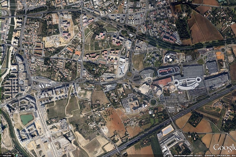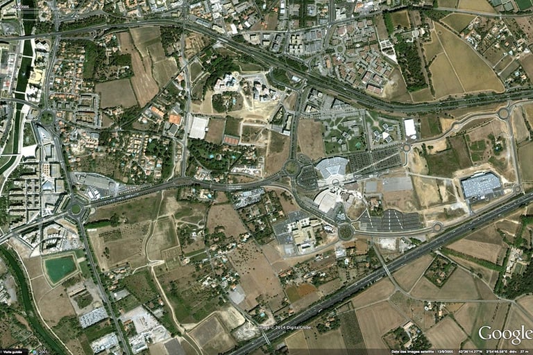 En dehors des programmes d’entrepôts et de distribution, les projets de commerces ont été nombreux dans les années 2000. Certains ont porté des ambitions fortes d’accessibilité et de couture vis-à-vis de leur contexte urbain, certains moins (ci-dessous, 2 avatars de ces projets : Odysseum à Montpellier et Atoll à Angers). Par rapport à la question de la continuité de la Ville Franchisée, il est clair que les grandes opérations d’urbanisme commercial ont continué de s’implanter sur les noeuds autoroutiers, axes de consommations privilégiés et rentables. Si Odysseum respecte son contexte et porte un programme de mixité, le cas de l’Atoll d’Angers est éloquent. Dépassant ses objectifs de fréquentation, cette opération est l’expression même de la ville branchée sur autoroute. L’Atoll, une île dans la campagne.