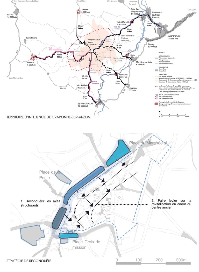 Il s’agissait tout d’abord de comprendre le contexte territorial dans lequel se trouve Craponne (le Parc Naturel Régional, l’aire d’influence de la mobilité Craponnaise, le système urbain de Saint-Etienne tout proche), analyse qui fait l’objet des cartes ci-contre. Cela nous a permis de montrer que Craponne est un bassin de vie à part entière, plus autonome économiquement et culturellement que les bourgs comparables environnants, un atout sur lequel s’appuyer pour rebâtir une stratégie de reconquête du centre-bourg.