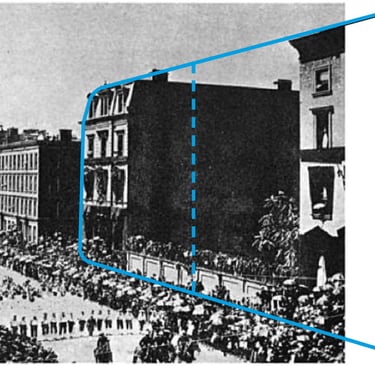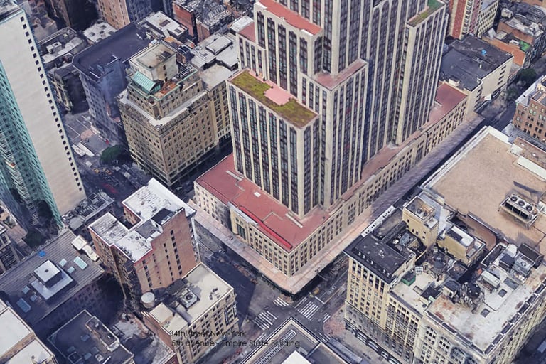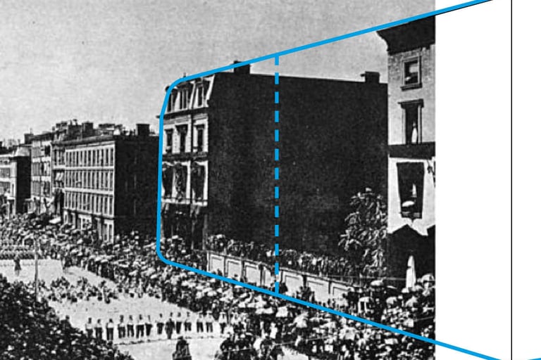 Aux USA à peu près toutes les villes ont été mangées par ce phénomène. Je vous propose un petit détour par New-York pour raconter une petite histoire (rigolote en plus) qui fait exemple. Avant 1893, le croisement de la 34ème rue et de la 5ème avenue, c’est ça : 2 maisons bourgeoises dos à dos qui appartiennent à une famille.