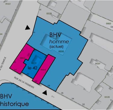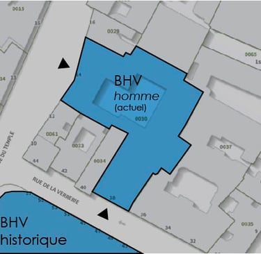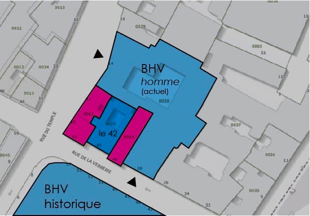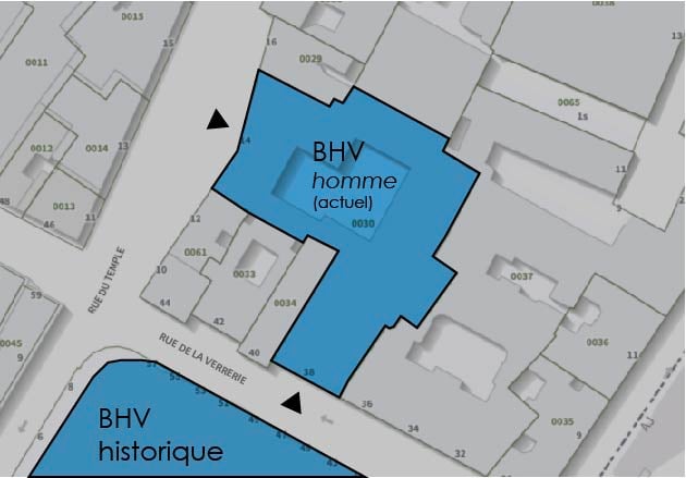 D’abord de quoi parle-t-on ? BHV possède déjà une extension au delà de la rue de la Verrerie. Elle est traversante et fait le lien avec la rue du Temple. En voici un plan et les photos des 2 façades.