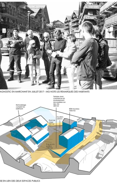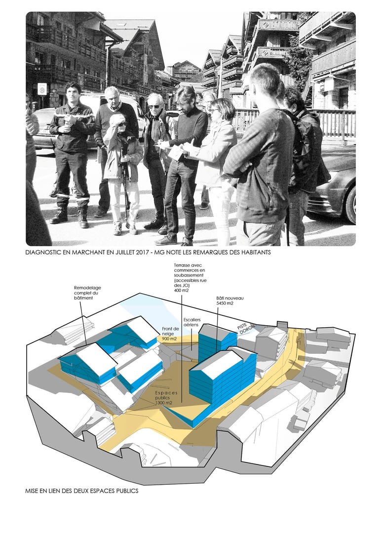 La station de ski de Méribel, petit bourg de 1500 habitants permanents et fondé sur l’économie du sport d’hiver, s’est constitué entre trois contraintes de développement : l’inondabilité du fond de vallée, la constructibilité des pentes et le besoin des hébergements de se rapprocher au maximum du front de neige et de l’accessibilité aux pistes. Cela a donné naissance à une ville en goulot d’étranglement, où une seule rue historique (la rue des Jeux Olympiques) relie les deux places commerçantes du centre. Cette configuration étouffe d’autant plus Méribel que les équipements vieillissent et ne s’ouvrent pas sur la ville et que les infrastructures routières ne sont pas adaptés à la vie piétonne. En sus, dans le contexte du réchauffement climatique, le principe économique de la vallée (l’exploitation du ski) est en stagnation relative et les investissements doivent se faire dans une forte économie de moyens.