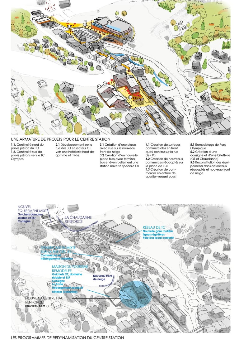 La rue des Jeux Olympiques devient l’armature piétonne du centre en articulant la place haute (autour de l’office du Tourisme) et le front de neige.