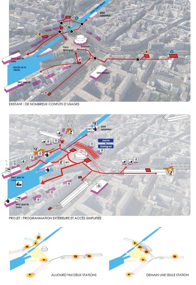 Les parties inutilisées des arrêts Jaurès et Stalingrad peuvent servir pour d’autres usages compatibles (avec les contraintes des sous-terrains : boîtes de nuit, micro-musées, expos) renforçant l’offre cuturelle du quartier.