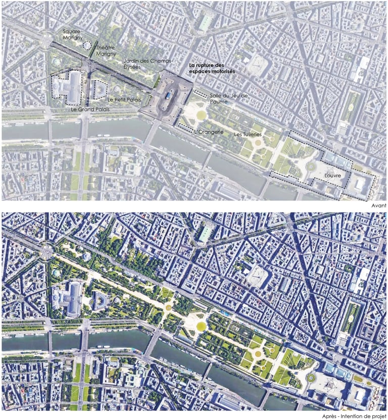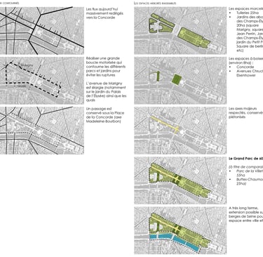 Une constellation de petits jardins aux abords des Champs-Élysées qui totalisent 20ha et fortement sous-utilisées du fait des coupures automobiles omniprésentes (square Marigny, square Jean Perrin, Jardin des Champs-Élysées, jardin du Petit Palais, Square de Berlin, jardin de la nouvelle France)