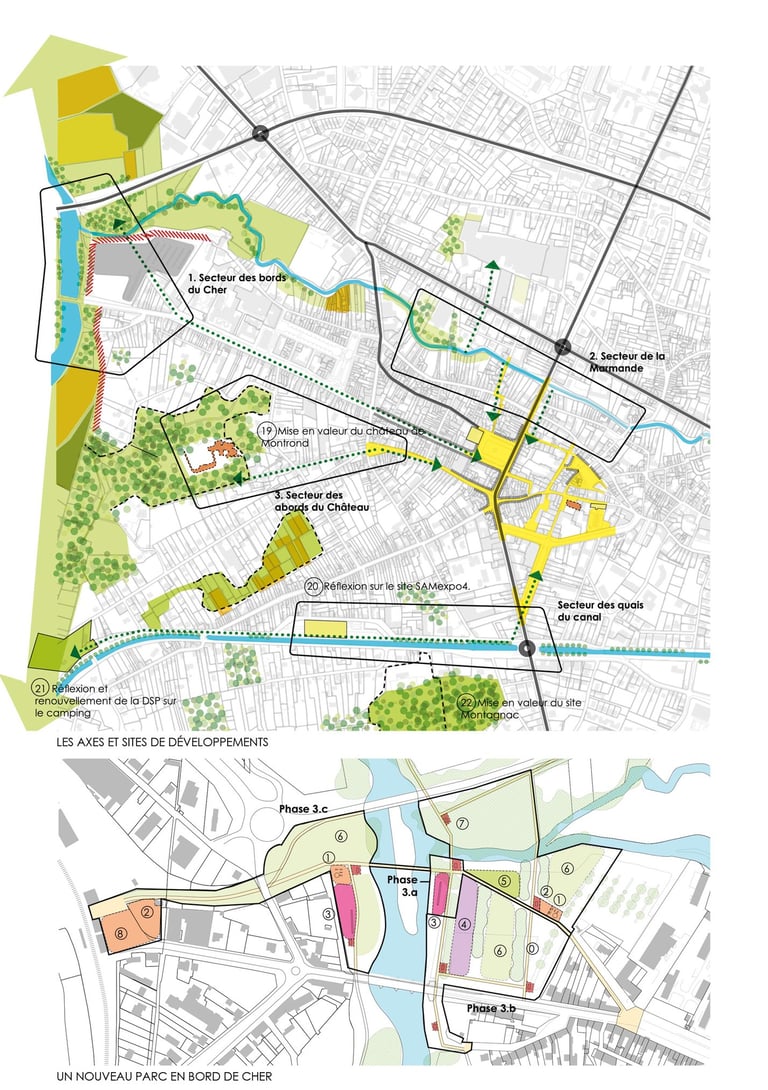 • Axe nord-sud de la Marmande au canal en reliant l’îlot Bussière, la Place de la République et le Canal,en passant par la gendarmerie et le Parc Montagnac