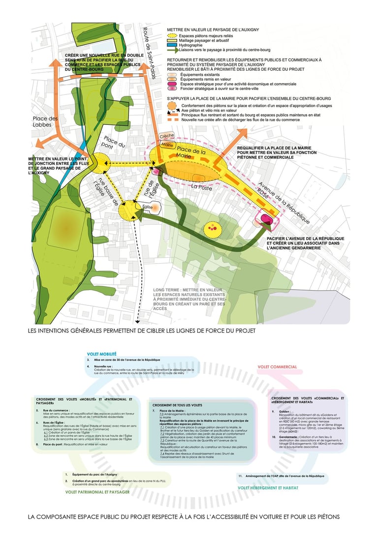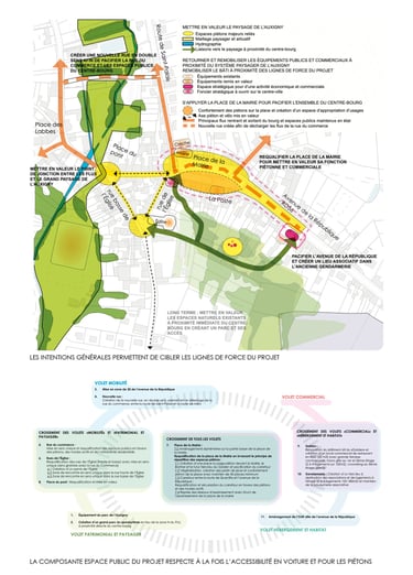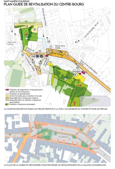 Afin de revitaliser le centre-bourg de Saint Martin d’Auxigny, sur la base de la création d’une nouvelle rue entre la route de Saint-Palais et la route de la poste, qui permet de désaturer la rue du commerce et de la requalifier, ce plan guide propose plusieurs axes d’intentions : D’une part il s’agit de «retourner» le fonctionnement de la place de la Mairie en disposant son parvis au sud, en lien avec les fonctions commerciales du centre-bourg. D’autre part des programmes visants à renforcer l’effet de centralité du centre-bourg sont prévus. Enfin le plan guide part du constat que la place de la Mairie est principalement attractive du fait de son linéaire commercial au sud, mais que celui-ci n’est pas mis en valeur car le parvis de la place est au nord. En outre, les espaces naturels au sud du centre-bourg ne sont pas mis en valeur et ne sont aujourd’hui pas accessibles.