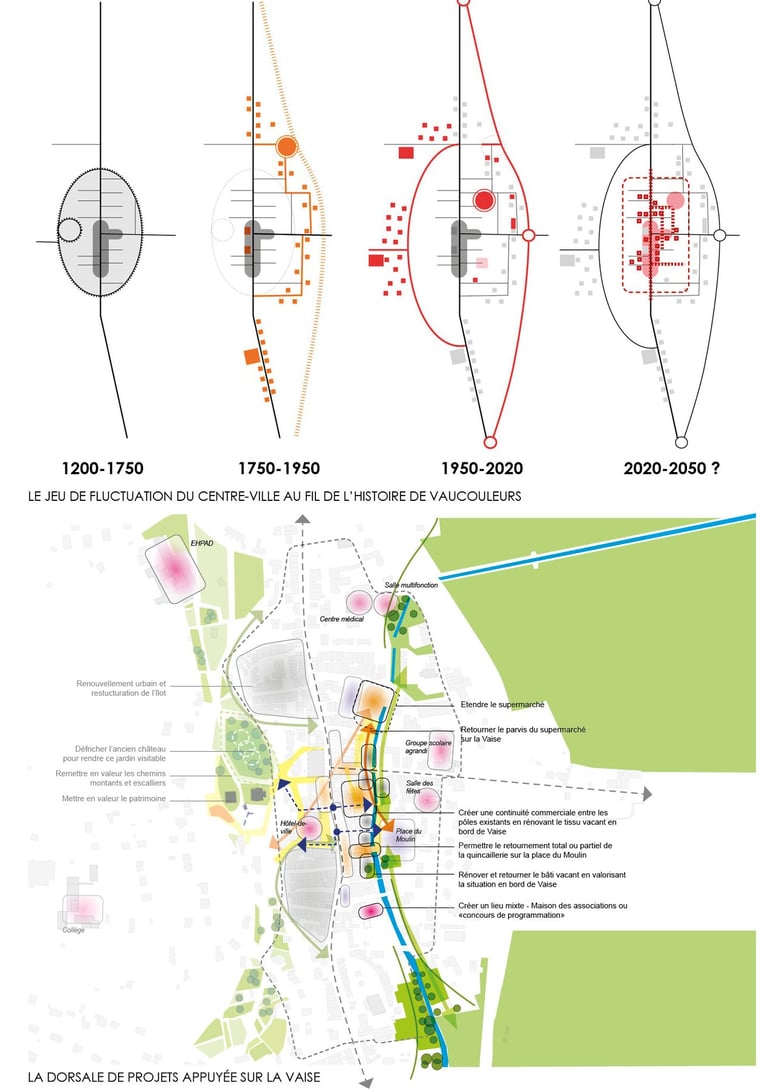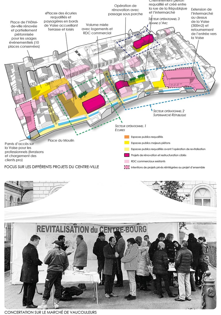 La Vaise devient un axe de flux et d’usages (en plus d’un axe écooique) qui permet de réadresser les locomotives du centre-bourg. Les quais deviennent un cheminement piéton qui complète la rue Jeanne d’Arc et densifie l’offre commerciale dans l’hyper-centre en lien avec l’offre de stationnements remise en valeur de la Place du Moulins et du supermarché.